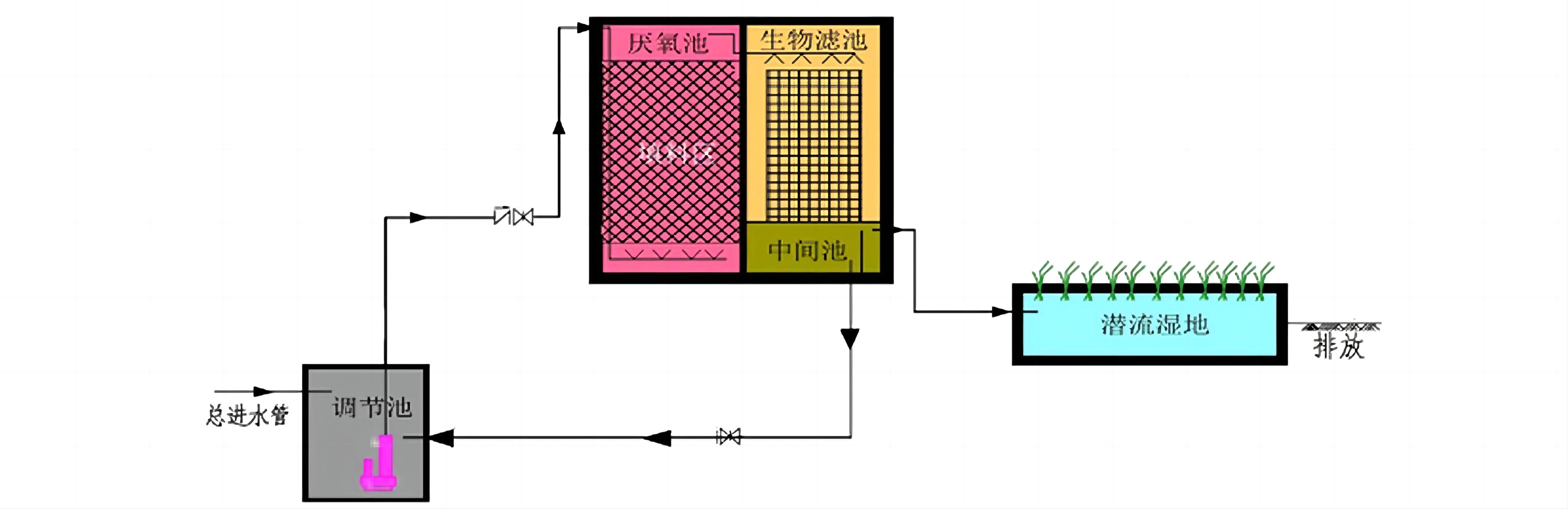工藝原理∶模塊化分層生物滴濾池屬于生物膜法污水處理工藝范疇,主要由集水池、復合濾床、中間池、人工濕地等部分組成。通過特殊強化濾料進行生物和生態(tài)處理實現污水達標處理。