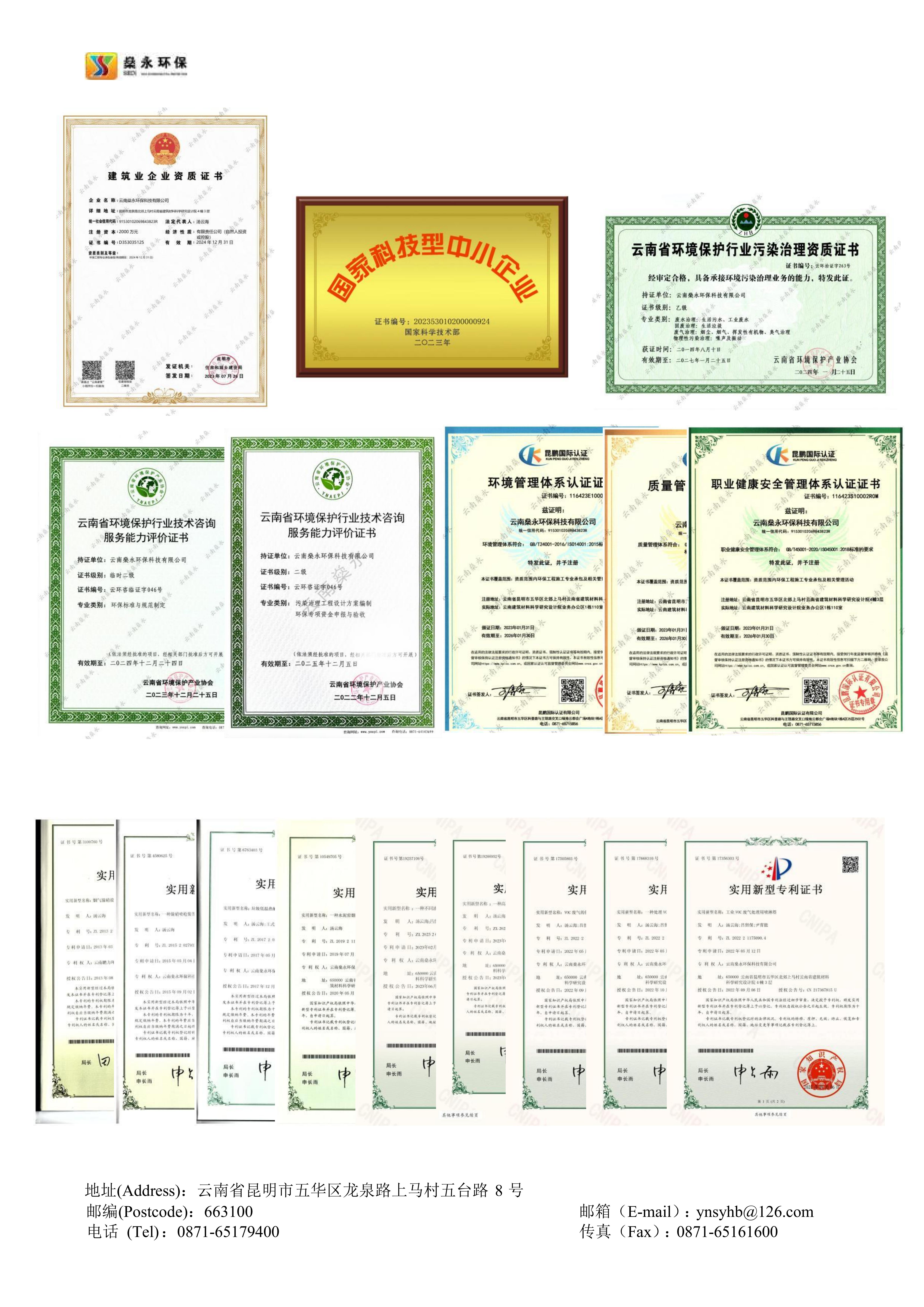 燊永公司堅(jiān)持創(chuàng)新、協(xié)作、共贏的價(jià)值觀,以專業(yè)、專心、專注為服務(wù)理念,以求實(shí)、求是、求精為質(zhì)量宗旨,為客戶提供優(yōu)質(zhì)、高效、貼心的服務(wù)。公司獲得國(guó)家專業(yè)部門頒發(fā)的《環(huán)境工程專業(yè)承包三級(jí)》資質(zhì)、《污染治理乙級(jí)》資質(zhì)、《企業(yè)信用等級(jí)A級(jí)》證書、《云南省科技型中小企業(yè)》認(rèn)定證書、ISO9001/GBT50430質(zhì)量管理體系》證書、ISO14001環(huán)境管理體系》證書、ISO45001職業(yè)健康安全管理體系》證書等多項(xiàng)榮譽(yù)和多項(xiàng)的專利技術(shù)。